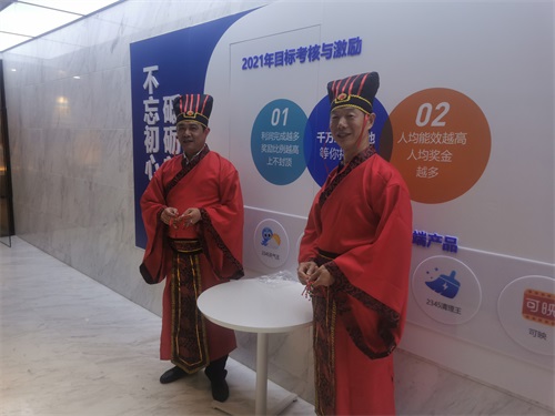 剛出2樓電梯,兩位身穿戰(zhàn)國傳統(tǒng)服飾的師傅迎來,向到場的伙伴派發(fā)寓意祈福納吉的彩繩手環(huán),傳遞祝福,祈愿安康。
